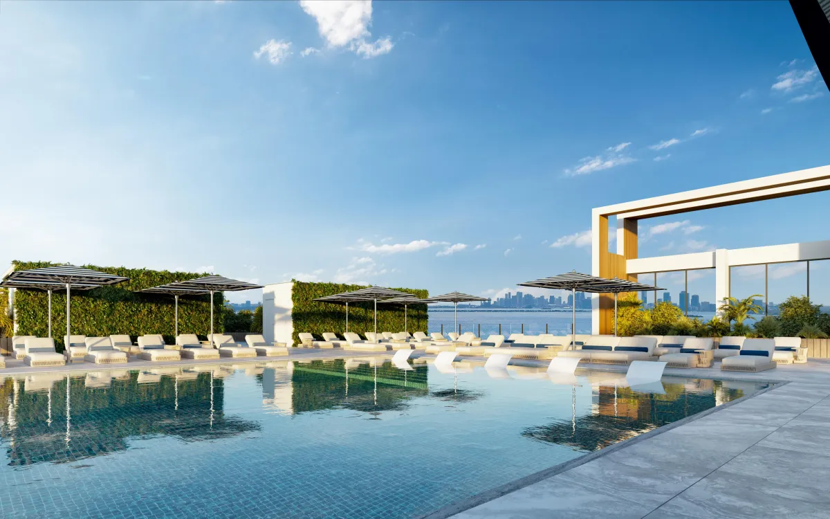 Amplia terraza con piscina en la azotea que incluye una piscina climatizada, cabañas de lujo y cocina de verano con vistas panorámicas al agua